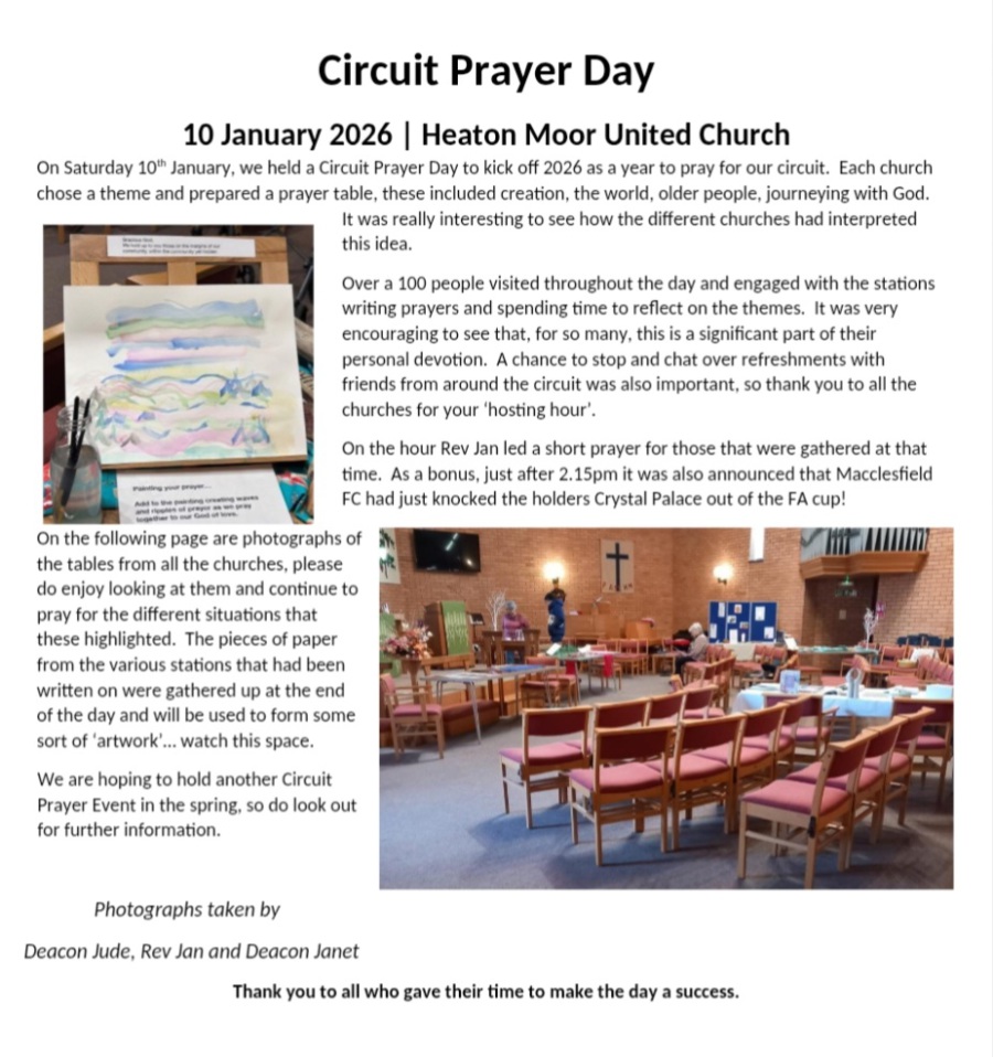 If you are unable to make the Service at Heaton Mersey Methodist Church you are always welcome to attend one of the other Churches in our Circuit. You can find out what's planned at other Churches on the Circuit web-site